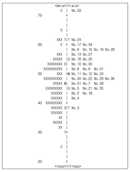 Item difficulty. (Notes: The left map is about person’s ability and the right map is about items’ difficulty. Abler persons and more difficult items are placed on the top of the diagram. # = one persons, M = mean, S = 1 SD from the mean, and T = 2 SD from the mean.).
