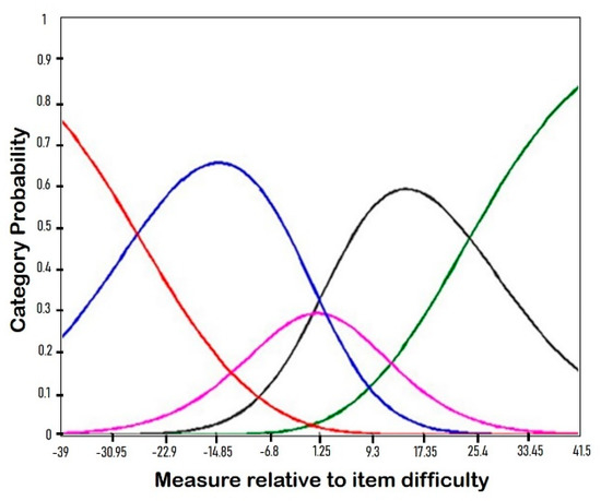 The rating scale analysis also presented reliable results. Both the infit and outfit of each reply category were below 1.5 [23]. The category level extent for the infit MNSQ was from 0.88 (category level 3) to 1.19 (category level 1) and from 0.85 (category level 3) to 1.11 (category level 1) for the outfit MNSQ. The 5-point scale of the K-PSI-SF revealed the characteristics of the item responses. The probability curve of the K-PSI-SF (Figure 2) showed the appropriateness of the 5-point scale in this regard.