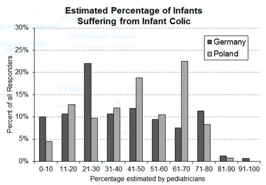 Frequency distribution of German (n = 152) and Polish (n = 133) pediatricians’ estimates of average occurrence rates of infantile colic in infants aged 0–5 months.