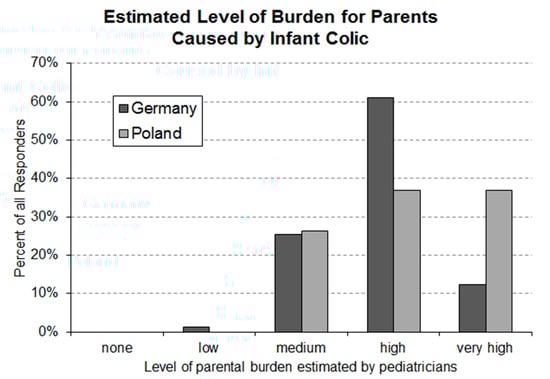 Nearly all pediatricians in both countries stated that infantile colic is causing a medium or higher level of parental burden (Figure 2). In total, 61% of the responding German and 37% of the Polish pediatricians assumed that infantile colic causes a high burden for parents. Very high parental burden was assumed by 12% of the German and by 37% of the Polish pediatricians.