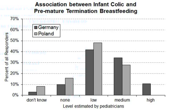 The recommendation for breastfeeding during the first six months of a newborn’s life [28,29,30] is generally accepted. Knowing the factors that can potentially have a negative impact on breastfeeding is of importance for pediatricians. Over 90% of the responders in Germany and Poland acknowledged their awareness of the association between infantile colic and premature termination of breastfeeding. However, the level of association assumed by the responders is rather medium than high or very high. Motivating mothers of colicky babies to continue breastfeeding, even if it fails to comfort the crying baby [7], is a worthwhile objective to be promoted in front of pediatricians.