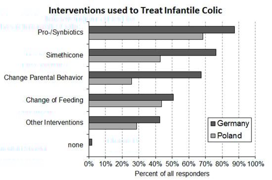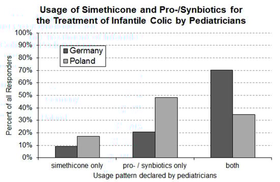 The findings of the present study indicate that the majority of pediatricians employ pharmaceutical interventions to manage crying babies. Pharmacological treatment of infantile colic is focused around the intervention with pro-/synbiotics and simethicone. There is increasing evidence that certain pro-/synbiotics improve the crying behavior of colicky babies [15,16,17,18,19]. In contrast, published data for simethicone are more in line with the conclusion that this product is a safe placebo without significant therapeutic effects on infantile colic [4]. Few pediatricians in either country are exclusive users of simethicone. In Poland, nearly 50% of the responding pediatricians exclusively use pro-/synbiotics; the corresponding figure in Germany is slightly above 20%. Moreover, 70% of the German and some 30% of the Polish pediatricians have both product categories in their treatment repertoire. For a significant number of pediatricians in both countries, non-pharmaceutical interventions (e.g., change of parental behavior and change of feeding) are an important part of their treatment repertoire.