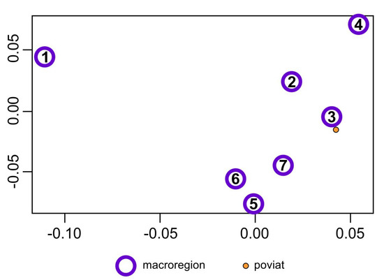 Figure 2 shows the mutual position of the seven macroregions in the system of the first two composed indicators (kernel discriminant coordinates).