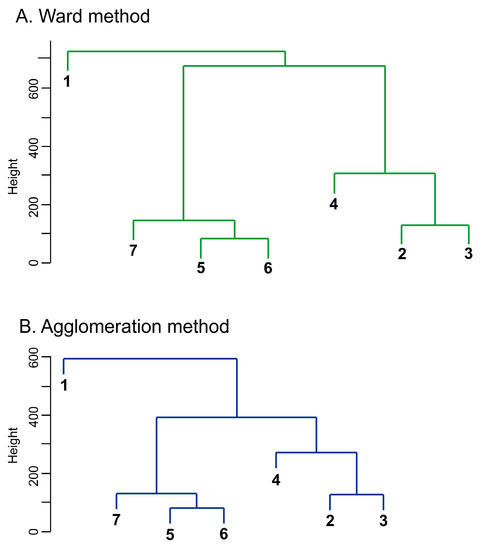 On the basis of the Mahalanobis distances, dendrograms were constructed using the agglomeration method and the Ward method to identify areas with similar degrees of sustainable development. Both provided results identical to the ones illustrated in