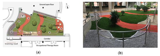 A multisurface terrain path in an outdoor therapeutic garden was designed by interdisciplinary cooperation among landscape architects, rehabilitation therapists, and care workers and is a part of the atrium garden of the rehabilitation center in the nursing home. The garden was also conveniently located near the occupational therapy room (Figure 1a). An enriched environment was formed with fresh air, abundant sunlight, lush vegetation, and intermittent birdsong (Figure 1b). The multisurface terrain is the most important component of the therapeutic garden in the form of a path constructed with various materials of different characteristics, including grassland (uneven texture, firm support), plastic cement (even texture, medium support), sand (fine texture, loose support), gravel (coarse texture, medium support), and unfixed pebbles (uneven texture, loose support). It was co-designed with medical staff to determine that the materials used in the path were selected based on evidence in the literature [19,20,21,22,23,24,25,26,27]. Walking from the starting point to the endpoint was a route of approximately 64 m. Double layer railings were set on both sides of the path to ensure safety, and rest seats, signage, and other supporting facilities were also set in place.