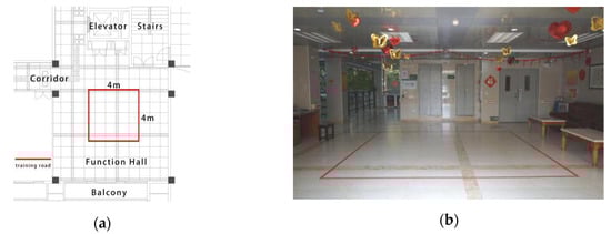 The training ground for the ISGG was located in an indoor public hall of a residential building in the nursing home (Figure 2a). A red square with a side length of 4 m was pasted on the floor of the hall that was flat and anti-slip and provided firm support. Sofa and seats placed beside the square line could be used to rest. The natural light from the window on one side of the hall combined with the auxiliary illumination of ceiling lamps in the hall ensured that there was enough light during training (Figure 2b).