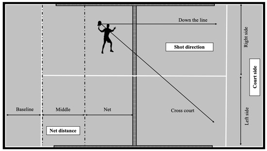 Figure 1. Hitting zones (net distance and court side) and shot direction. - Shot direction: Two possible trajectories were distinguished: down the line and cross court (Figure 1).