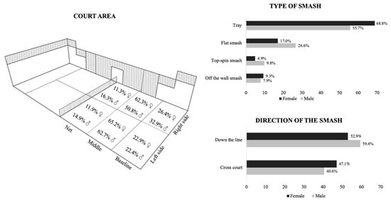 Figure 2 shows the results of the distribution percentages of the different smashes analyzed according to the type of smash, direction of hitting and court area comparing by gender. According to smash frequency, significant differences were found between genders (χ2 = 26.423; gl = 3; p < 0.001; V = 0.161). The female player performed significantly more tray strokes than male (CSR = 4.3. Otherwise, the male player made more flat (CSR = 3.7) and top-spin smashes (CSR = 3.0) than female players. Depending on the area of the court, most of the smashes were made in the middle area of the court for both genders. In relation to the direction of the smash, male players performed significantly more down the line strokes than female (χ2 = 4.281; gl = 1; p = 0.039; CSR = 2.1; V = 0.065).