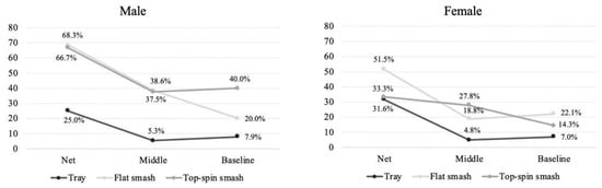 Figure 3 shows the percentage of winning points depending on the type of smash and the area of the court by gender. In general lines, male and female players make more winning smashes in the net area than the others. Moreover, male players made more flat and top-spin smashes than females regardless of the hitting area. On the contrary, the female players made more winner shots with the tray stroke only at the net area.