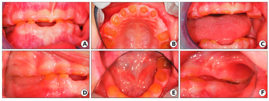 Clinical oral manifestation of DGI-II in the proband of the 5-year-old girl of the DGI-II family. The intraoral photographs showed severe attrition of the primary dentition to the gingiva level with color deviation from normal to yellow–brown with a translucent appearance. (A) Intraoral photo of the anterior view (mouth closed). (B) Intraoral photo of the maxillary arch. (C) Intraoral photo of the anterior view (mouth open). (D) Intraoral photo (right side), (E) Intraoral photo of the mandibular arch. (F) Intraoral photo (left side).