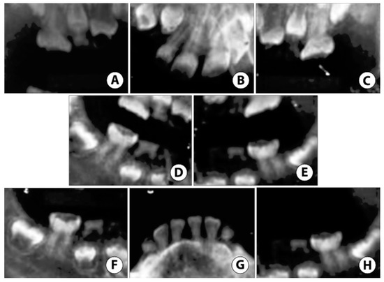 Case 2: Non-digital radiographs taken in the hospital under General Anesthesia (GA) reveal (A–C) severe enamel loss with reduced pulp space in both primary and permanent teeth. (D,E) Root tip fragments of upper primary canines noted. (F,H) Extensive atypical occlusal caries noted on lower permanent first molars. (G) Reduced pulp space in permanent mandibular incisors with near exfoliation of lower primary canines.