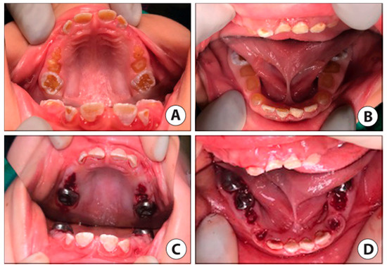 Case 2 clinic photos. (A) Pre-op intraoral photo of the maxillary arch. (B) Pre-op intraoral photo of the mandibular arch (mandibular first molars partially visible). (C) Post-op intraoral photo maxillary arch reveals stainless steel crowns (SSC) restorations permanent first molars, facial resin-modified glass ionomer (RMGI) restorations, lingual sealants on permanent incisors, and blood clots at extraction sites of all remaining primary teeth. (D) Post-op intraoral photo mandibular arch reveals SSCs placed on permanent first molars (lower left permanent first molar not visible) and second primary molars, with the extraction of primary first molars and canines. RMGI placed on facial surfaces of anterior incisors.