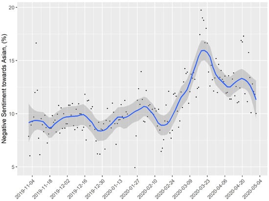 Temporal changes in negative Asian sentiment, November 2019–April 2020. n235,263 tweets. LOESS (locally estimated scatterplot smoothing) was performed to fit smooth curves to the daily prevalence of negative sentiment. The shaded area represents 95% confidence bands around the smoothed trend line.