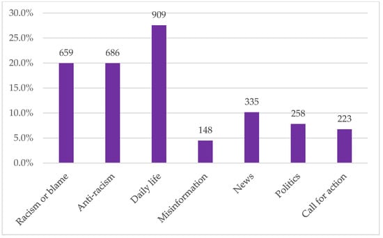 In the random sample of 3,300 tweets for the thematic analysis, 20% had themes expressing racism or blame, 20% had themes expressing anti-racism, and 27% tweets related to daily life impacted by the pandemic. Less common themes included tweets about misinformation (4%), news (10%), politics (8%), and call for action (7%) (Figure 2). Tweets that mentioned President Trump accounted for 18% of tweets across the categories. This qualitative content analysis focuses on understanding the meaning of the tweets, so we provide a detailed description of each theme, temporal patterns from February to April. Illustrative example tweets are presented in Table 4.