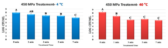 To assimilate the effects of mild heat for augmenting the decontamination efficacy of pressure-based pasteurization, the experiment was conducted at two controlled temperatures of 4 and 40 °C. It is noteworthy that a pressure of 450 MPa is more than four times higher than the pressure in Mariana Trench, the earth’s deepest oceanic trench [44]. However, this pressure is still considered as a medium level of pressure in food manufacturing, as vast majority of pressure-treated products in commerce are treated at 650 MPa [12,13,14,16]. Currently, pressure-treated products typically have slightly higher operation cost relative to traditional thermally treated products, thus the application of lower levels of pressure coupled with mild heat and/or bacteriocin and bactericidal compounds could be of great importance for stakeholders to optimize their cost. The application of pressure at higher levels is typically associated with a higher cost of operation and maintenance of the pressure vessels [12].