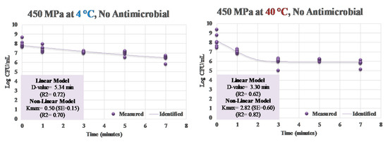 For samples treated at 4 °C, control counts of S. aureus was 7.95 ± 0.4 log CFU/mL (Figure 1). These counts after treatment at 450 MPa were reduced (p < 0.05) by 0.54, 0.88, 0.98, and 1.51 log CFU/mL after 1, 3, 5, and 7 min treatments, respectively (Figure 1). The application of mild heat at 40 °C, to a great extent, augmented the decontamination efficacy of the treatment. Control counts and those obtained after 1, 3, 5, and 7 min of treatment were 8.21 ± 0.7, 7.02 ± 0.2, 5.93 ± 0.4, 6.13 ± 0.1, and 5.77 ± 0.3 log CFU/mL, respectively (Figure 1). These reductions (p < 0.05) were appreciably higher than those obtained at 4 °C. As an example, while 1.51 log CFU/mL reductions (p < 0.05) were obtained after 7 min of treatment at 450 MPa and at 4 °C, the same treatment at 40 °C resulted in 2.44 log CFU/mL reductions (p < 0.05) of S. aureus (Figure 1). Linear and non-linear inactivation indices exhibited similar trends (Figure 2). While 5.34 min was needed for a 90% reduction in S. aureus at 4 °C during a 450-MPa treatment (i.e., D-value = 5.34), the same treatment at 40 °C required 3.30 min for decontamination of the pathogen (Figure 2). The non-linearly calculated Kmax additionally illustrated the effects of mild heat for enhancing the decontamination efficacy of the treatment. Kmax values for samples treated at 4 and 40 °C at 450 MPa were 0.50 and 2.81 1/min, respectively (Figure 2). These findings are in harmony with the previous literature, where S. aureus was reduced by 1.61 to 2.73 log CFU/mL after 9 min of hydrostatic pressure treatment at 450 MPa [37]. Similarly, 2.69 log reductions in S. aureus were reported after pressure treatments of samples at 40 °C and at 400 MPa [38].
