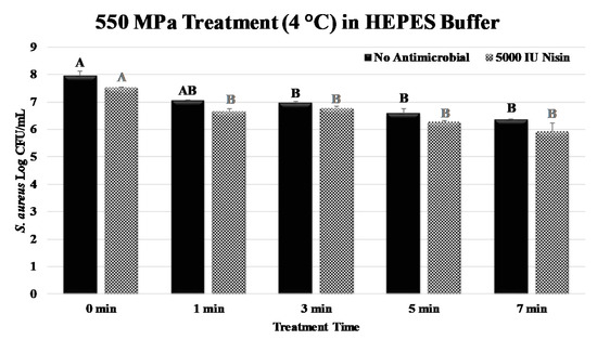 Inactivation of S. aureus by elevated hydrostatic pressure (550 MPa at 4 °C) in the presence of 5000 IU of nisin. Values followed by different upper-case letters are statistically (p < 0.05) different than each other (pair-wise comparisons, Tukey-adjusted ANOVA). For samples treated without antimicrobial (solid bars) and those treated in the presence of nisin (patterned bars) statistical analyses are presented separately by upper-case letters with different colors.