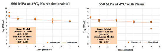 The calculation of linear and non-linear inactivation indices exhibits a similar trend. D-value, amount of time needed for one log (e.g., 90%) reduction in the pathogen, was similar for elevated hydrostatic pressure treatments with and without added nisin (Figure 4). These values were 5.15 and 5.22 min for samples treated without and with nisin at 4 °C. The inactivation index Kmax has the unit of 1/min, thus lower values correspond to a higher inactivation rate and vice versa [39]. The Kmax values for samples treated with and without nisin at 550 MPa and at 4 °C were similar and were 26.70 and 24.83, respectively (Figure 4).
