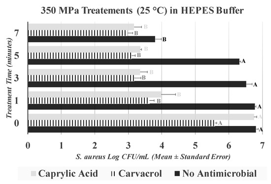 This section summarizes the results of samples treated at 25 °C in the presence of 0.5% (v/v) carvacrol and 0.5% (v/v) caprylic acid. It is noteworthy that, as previously elaborated, immediately after treatments, samples were neutralized using D/E broth, thus exposure times to antimicrobials were controlled and residual amounts of antimicrobials on surface of the medium were mitigated. For samples treated at 350 MPa (without antimicrobial) the control counts and those obtained after 1, 3, 5, and 7 min of treatments were 6.81 ± 0.1, 6.78 ± 0.0, 6.52 ± 0.2, 6.31 ± 0.0, and 3.80 ± 0.2 log CFU/mL, respectively (Figure 5). These values remained statistically unchanged during the 1, 3, and 5 min of treatment (p ≥ 0.05) and only a 7-min treatment was able to reduce (p < 0.05) S. aureus (Figure 5).