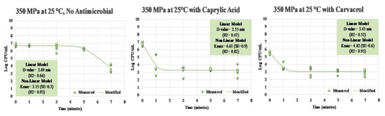 Linear and non-linear inactivation indices for S. aureus treated by hydrostatic pressure (350 MPa at 25 °C) in the presence of 0.5% (v/v) caprylic acid and 0.5% (v/v) carvacrol. Measured = Actual observations; Identified = Best-fitted non-linear model.