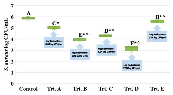 Inactivation of S. aureus by elevated hydrostatic pressure in presence of bacteriocin and bactericidal compounds and mild heat. Control: Untreated control (0 MPa at 4 °C for 3 min); Trt. A: Treated control (650 MPa at 4 °C for 3 min). This treatment is currently the industry standard for pressure-based pasteurization [12,13,14]. Trt. B: Treatment of 550 MPa at 4 °C for 3 min with 5000 (w/v) IU nisin. This treatment is further investigated under the second experiment of this study, summarized in Figure 3 and Figure 4. Trt. C: Treatment of 450 MPa at 40 °C for 3 min. This treatment is further investigated under the first experiment of the study, summarized in Figure 1 and Figure 2. Trt. D: Treatment of 350 MPa at 25 °C for 3 min with 0.5% (v/v) carvacrol. Trt. E: Treatment of 350 MPa at 25 °C for 3 min with 0.5% (v/v) caprylic acid. The last two treatments are further investigated under the third experiment of the study, summarized in Figure 5 and Figure 6. Values followed by different upper-case letters are statistically (p < 0.05) different than each other (pair-wise comparisons, Tukey-adjusted ANOVA). Values followed by * are statistically (p < 0.05) different than untreated control (Dunnett’s-adjusted ANOVA). Values followed by ^ are statistically (p < 0.05) different than Trt. A., e.g., treated control (Dunnett’s-adjusted ANOVA).