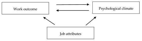Our study builds on two theoretical approaches: the non-recursive model of causal relationship between job perception domain of psychological climate and job satisfaction proposed by James and Tetrick [26], and the job demands-resources model of Bakker and Demerouti [27,28,29]. Although these approaches use different terminology, both focus on the relationships between job perception and/or job resources and work outcomes. Both models also assume a reciprocal relationship between these elements. However, the models differ in their focus. James and Tetrick [26] focus on psychological climate and its effect on work outcomes, while Bakker and Demerouti [27,28,29] explore how work outcomes are affected by job resources and job demands. Since psychological climate is classified as a job resource [30], both models are complementary for our research and using both is adequate for our investigation of the reciprocal relationship between psychological climate and work outcomes. Both are presented below.