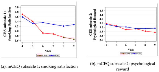 Linear mixed-effects models for repeated measures were used to analyze and compare the change over time for the mCEQ and CLS across two treatment groups (RNC and UNC). The first-order autoregressive (AR(1)) structure was assumed for repeated measures in all models. The linear mixed models were used to evaluate the effects of discrete time (visits 4–9), groups (RNC vs. UNC group), and the time-by-group interaction, while adjusting for the baseline (visit 3) measure of the outcome. Known confounders (e.g., sex, site, and menthol flavor) were consistently included in the adjusted models, and other covariates were included since they may be possible confounders (age group, education, cigarette brand, race, FTCD score, cotinine, and employment status) [13]. Estimated least-squares mean differences and corresponding 95% confidence intervals (CIs) were reported from visits 4 to 9. Study data were collected, managed, and downloaded from the Research Electronic Data Capture (REDCap) hosted at the Penn State College of Medicine [19]. A total of 245 participants completed the study: 122 in the reduced-nicotine level group and 123 in the usual-nicotine level group. Analyses were conducted by the Penn State TCORS Biostatistics and Database Management Core using statistical software SAS Version 9.4 (SAS Institute, Cary, NC, USA). All tests were two-sided at the 0.05 significance level.