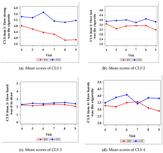 Figure 2 depicts the comparison between RNC and UNC on each of the 10 items in the CLS from visits 4 to 9. Table 2 lists the CLS mean differences between the RNC and the UNC groups with p-values. For CLS 1 (strength), comparison results indicated significant rating score differences between RNC and UNC from visits 4 to 9 (Table 2). The mean rating score for RNC decreased from visits 4 to 9, with the widest gap between the two treatment groups from visits 6 to 9 (Figure 2, CLS item 1). For CLS 5 (taste), the RNC group showed a significantly lower rating than the UNC group for all of the visits except visit 4. The mean difference between the two groups was the highest at visit 9 (Figure 2). For CLS 6 (satisfaction), significant differences were detected at visits 5, 6, 8, and 9. As for CLS 8 (likelihood of buying cigarettes) and CLS 9 (nicotine from cigarettes), the RNC group rated significantly lower from visits 6 to 9 compared to the UNC group (Table 2, Figure 2). For CLS 4 (harshness), CLS 7 (tobacco vs. just air), and CLS 10 (satisfying hit), three out of six visits showed significantly lower scores among the RNC group compared to the UNC group. For both CLS 7 and CLS 10, the difference between the two groups became significant at visits 6, 8, and 9, whereas CLS 4 became significant at visits 5, 8, and 9. For CLS 2 (heat), none of the visits showed significantly different scores between the two groups except visit 5. Lastly, for CLS 3 (hard to draw), the RNC and the UNC groups indicated no difference at any visit. The CLS mean differences between the RNC and UNC groups with 95% CIs are included in Table S3.