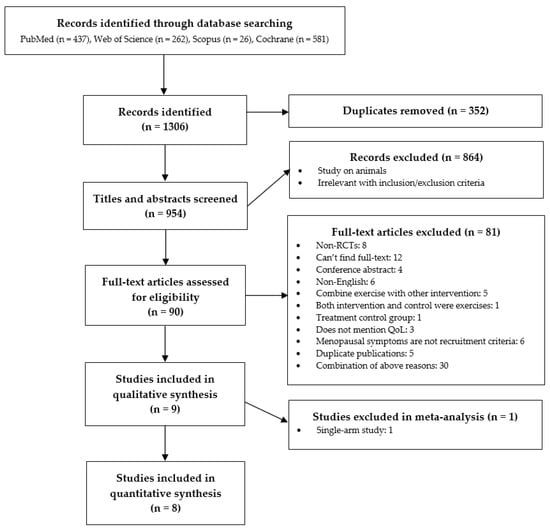 A total of 1306 studies were initially identified. After 352 duplicates were removed, 954 publications were eligible for title and abstract review. Of those, 864 studies were excluded based on the selection criteria (for example, because they used cognitive behavioral therapy, relaxation training, or nutritional intervention). After screening 90 possibly relevant studies as full texts, we further excluded 81 publications including (1) eight non-RCTs; (2) twelve unavailable full texts; (3) four conference abstracts; (4) six non-English articles; (5) five studies combining exercise with other interventions; (6) one study in which both the intervention and the control groups performed exercises; (7) one study using active treatment control group; (8) three studies not providing QoL quantitative outcomes; (9) six studies of menopausal women that did not mention any menopausal symptoms as inclusion criteria; (10) five studies published as different perspectives of the same project with the included studies; (11) 30 studies having a combination of the aforementioned reasons. Detailed reasons for full-text exclusion are presented in Supplementary Table S1. Next, of the nine articles included in the qualitative synthesis, the study by Mercier et al. [] was excluded as it is a single-arm study conducted as a substudy of an RCT. Finally, the eight remaining studies were included in the quantitative synthesis (meta-analysis). No further relevant study was found by checking the reference lists of the nine included studies and review papers. Figure 1 outlines the selection flow.