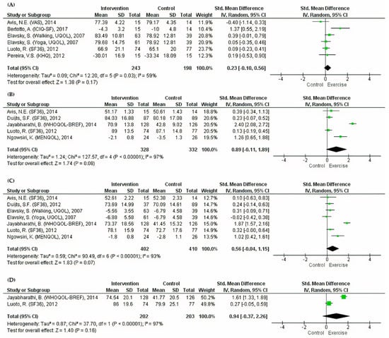 Meta-analyses of the effects of exercise on general QoL domains. (A) Forest plot of six datasets on general QoL. (B) Forest plot of five datasets on the physical component of QoL. (C) Forest plot of seven datasets on the psychological component of QoL. (D) Forest plot of two datasets on the social component of QoL.