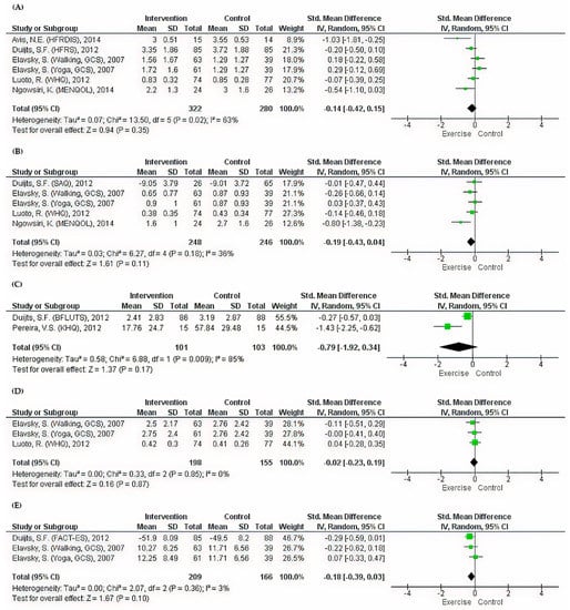 To the best of our knowledge, there have not been any meta-analytical studies examining the effect of exercise on either general or menopause-specific QoL in women with menopausal symptoms with which our findings may be compared. The majority of previous systematic reviews focused on menopausal symptoms in terms of frequency and intensity [,,,]. A recently published meta-analysis only identified an association between physical exercise and quality of life related to menopausal sexual symptoms [].