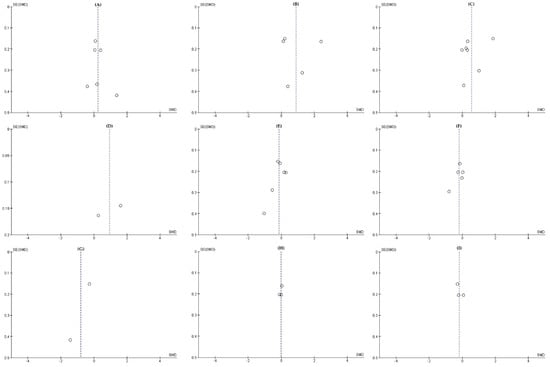 Funnel plots in the meta-analyses of the effects of exercise on nine quality of life (QoL) domains. (A) General. (B) Physical. (C) Psychological. (D) Social. (E) Vasomotor symptoms. (F) Sexual symptoms. (G) Urinary symptoms. (H) Somatic symptoms. (I) Total symptoms.