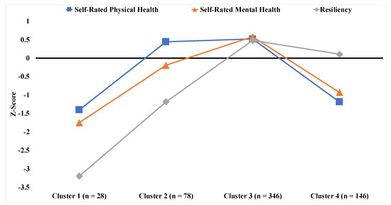 Figure 1. K-means cluster analysis on self-rated physical health, self-rated mental health, and resiliency. Note. n = 598. Higher Z-scores represent better health, mental health, or resiliency.