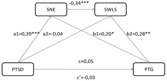 Mediation effect model among symptoms of trauma (PTSD), existential anxiety (SNE), life satisfaction (SWLS), and post-traumatic growth (PTG). * p < 0.05; ** p < 0.001; *** p < 0.0001.