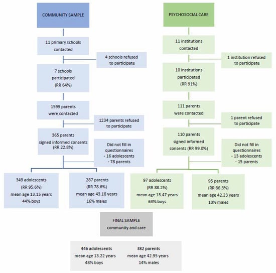 Participants from the care system (parents and their children) were recruited via institutions providing psychosocial care for adolescents with emotional and behavioral problems in the Kosice region in Eastern Slovakia that were approached from January 2017 until December 2018 via two-stage sampling. In the first stage, we contacted institutions; in the second stage, the parents or legal representatives of pupils were contacted. After being thoroughly informed of the consequences of participation in the study, parents were asked to provide us with signed informed consent on behalf of their children and themselves. Detailed information on the response rates and the number of participants with basic descriptive information can be seen in Figure 1.