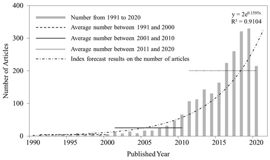 The number of annual research articles on household CO2 emissions (HCEs) from 1991 to 2020.