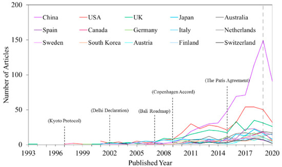 The trend of HCE research publications is related to climate change events that are important for the international community. For example, the United Nations Framework Convention on Climate Change (UNFCCC), adopted in June 1992, was the first international convention to control GHG emissions and combat climate change. Among the top 15 productive countries, the USA and the UK published one document related to HCEs in 1993. The Kyoto Protocol, adopted in December 1997 as a supplement to the UNFCCC, makes GHG reduction a national legal obligation. Developed countries such as the USA, the UK, Australia, Canada, and Austria began to pay attention to climate change and conducted research in the field of HCEs, leading to a slight increase in the number of publications. At this time, the world had not yet formed a unified and solid emission reduction action and climate negotiations agreement, and there was less concern about the national interests of various countries. Therefore, international attention to HCE research was generally not high.