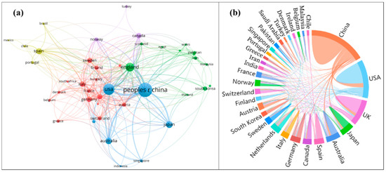The national cooperation network map of HCE research clearly reflects the central scale and concentration in different countries and effectively identifies the intensity of cooperation of various countries. This work draws national cooperation network maps for HCE research using VOSviewer software (Centre for Science and Technology Studies, Leiden University, Leiden, The Netherlands) (Figure 3a) and an online drawing platform named tubiaoxiu [29] (Figure 3b). From the perspective of country centrality, the characteristics of national cooperation in HCE research show a “three-core, multicenter” characteristic distribution centered on China, the USA, and the UK. This result further demonstrates the leadership of developed countries, represented by the USA and the UK, and developing countries, represented by China, in reducing GHG emissions and addressing climate change. Germany, Australia, Japan, Canada, and Sweden are other central countries in this field; they have also cooperated closely to make important contributions to HCE research. China, with the most publications on HCEs, holds a certain advantage in this research field. However, due to the relatively insufficient output of high-quality papers, China may not be sufficiently recognized by the academic community. It is necessary to consider cooperation among developing and developed countries in academic research, for example, on carbon labeling schemes [30], and market mechanisms [31]. Thus, there is an urgent need to strengthen cooperation among China and other countries, especially USA, the UK, and Australia, to enhance China’s influence on HCE research.