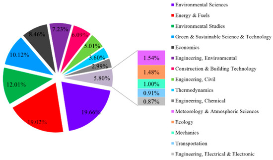As identified by the WOS platform, studies on HCEs involve 105 different categories. The top 15 productive categories of HCE research account for 87.35% of the total investigated publications, as shown in Figure 4. Among them, the environmental science category ranks as the top HCE-related category, with the highest percentage (19.66%). Other important research fields include energy and fuels (19.02%), environmental studies (12.01%), green and sustainable science and technology (10.12%), and economics (8.46%). HCEs are an interdisciplinary research topic involving energy, the environment, economics, green development, climate change, health, transportation, and other disciplines in the natural sciences. Therefore, HCE research can provide a comprehensive understanding of the overall knowledge of the environment, the economy, society, and technology.