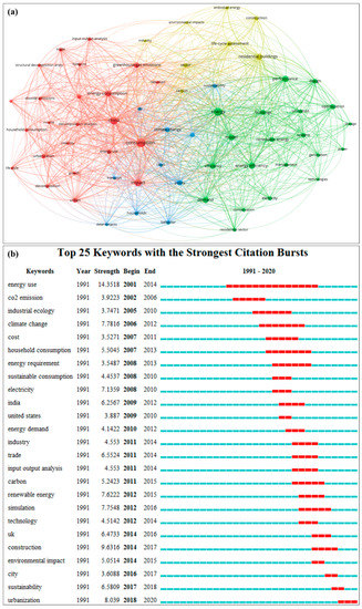 Burst detection is used to determine whether there has been any change in the research hotspots, and it can help to gain insights into future research topics [30,32]. We identify the keywords ranked by burst detection (the red rectangle means the strongest bursts), as shown in Figure 5b. In this study, there are 25 keywords with apparent bursts. This result implies that HCE research has been distinguished by the following three stages: In the first stage (2001–2010), as the infancy of HCE research, the burst keywords mainly included energy use, CO2 emissions, industrial ecology, climate change, cost, household consumption, energy requirement, sustainable consumption, electricity, India, the USA, and energy demand. In particular, HCE research was gradually extended to direct energy usage and indirect household consumption to evaluate emissions. In the second stage (2012–2014), the main keywords were industry, trade, input-output analysis, renewable energy, simulation, technology, the UK, construction, and environmental impact. In this stage, studies focused on HCE methods and the possible impact of HCEs on the environment as well as the related influencing factors, such as trade, technology, and renewable energy usage. The third stage, from 2016 to 2018, involved research on HCEs at the city level and focused on sustainability and urbanization. HCE research shifted from the whole country (such as in India, the USA, the UK) scale to the micro scale, such as the city level.