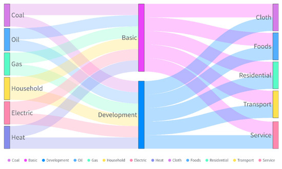 Comparative research on HCEs regarding different consumption behaviors requires extensive attention. The urban population has increased substantially with the rapid progress of urbanization, causing a continuous increase in direct energy consumption by households for cooking, traveling, heating, and other household activities [70]. Additionally, with improvements in household living conditions and quality of life, indirect energy consumption from various products and services is inseparable from the direct energy supply. HCEs mainly come from CO2 emissions that are active in indirect household consumption. Consumption actions in household areas, such as clothing, food, buildings, transportation, and household appliances, can significantly reduce CO2 emissions and provide more benefits to residents. Furthermore, the relationship between HCEs and all kinds of “flows”, such as energy types and behaviors, should be considered.