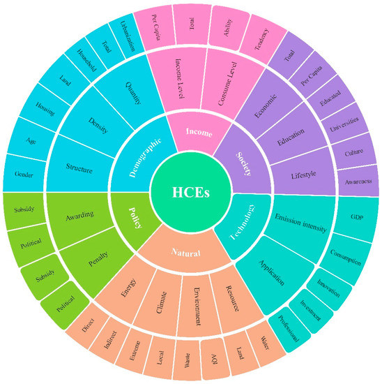 - The natural factors of HCEs include resources (such as water and land), the environment (such as the air quality index (AQI) and refuse disposal), climate (such as local climate and extreme climate), and energy (such as direct energy usage and indirect energy consumption). Studies on the impact of natural factors on HCEs have mainly focused on the relationships among HCEs and climate change. For example, Nie et al. found that the climate effects caused by abnormal temperatures led to income growth, which led to the use of more household energy consumption and the production of more HCEs [59].