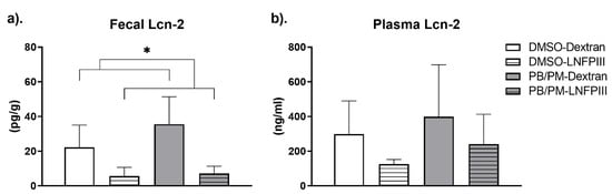 - Chassaing, B.; Srinivasan, G.; Delgado, M.A.; Young, A.N.; Gewirtz, A.T.; Vijay-Kumar, M. Fecal lipocalin 2, a sensitive and broadly dynamic non-invasive biomarker for intestinal inflammation. PLoS ONE 2012, 7, e44328. [Google Scholar] [CrossRef]