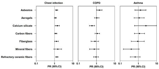 In multi-exposure models, we did not observe any collinearity between the exposures (VIF < 3), and only asbestos and refractory ceramic fibers remained associated with chest infections (Table S5). Although compared to single exposure models, the magnitude of associations lowered marginally, and the precision remained consistent (p < 0.05). The association between asbestos exposure and COPD persisted in the multi-exposure model, although the magnitude of the estimate increased moderately in the multi-exposure model (PR: 1.55; 95%CI: 1.08, 2.22) compared to the single-exposure model. While exposure to mineral fibers was found inversely associated with asthma in the multi-exposure model (PR: 0.22; 95%CI: 0.06, 0.80), the association was inconsistent compared to the single exposure model.