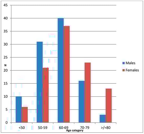 Men were significantly younger and there was a significantly larger number of females over the age of 70 compared to males (53 females vs. 31 males, p = 0.0005). The age distribution of the patients is shown in Figure 1.