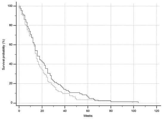 Tumor characteristics and management are shown in Table 3. There were no significant differences in tumor characteristics between males and females. Only ten patients (2.8%) were offered curative treatment while the rest were eligible for palliative management only and there was no difference between the two genders (p = 0.527). The commonest reason for patients being eligible for palliative management only was poor performance status (ECOG >1). By the end of the study, 179 (49.3%) of 363 subjects were known to have died. Kaplan–Meier survival curves are shown in Figure 2. The median length of survival noted in the group of confirmed deaths is 15 weeks and there was no difference between the genders (p = 0.24).