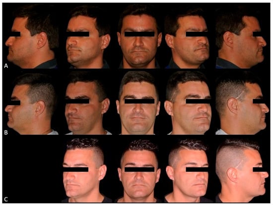 Extraoral view T0 (A); three-month post-surgical follow-up (B); two-year follow-up (C).