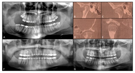 Radiographical analysis: T0 Orthopantomography (A); T0 Temporomandibular Joint (TMJ) Computed tomography scans of left TMJ in coronal (B) and sagittal view (C) and right TMJ in coronal (D) and sagittal view (E). Orthopantomography, three-week post-surgical follow-up (F). Orthopantomography, two-year follow-up (G).