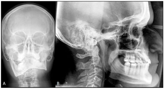 T0 skull radiography posteroanterior view (A); two-year follow up skull radiography laterolateral view (B).