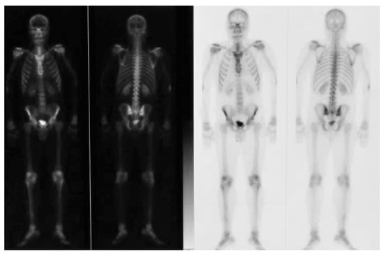 Bone scintigraphy was performed using a dose of 740 MBq of 99mTc-methylene diphosphonate and showed no hypermetabolic areas or pathological accumulation sites (Figure 5).